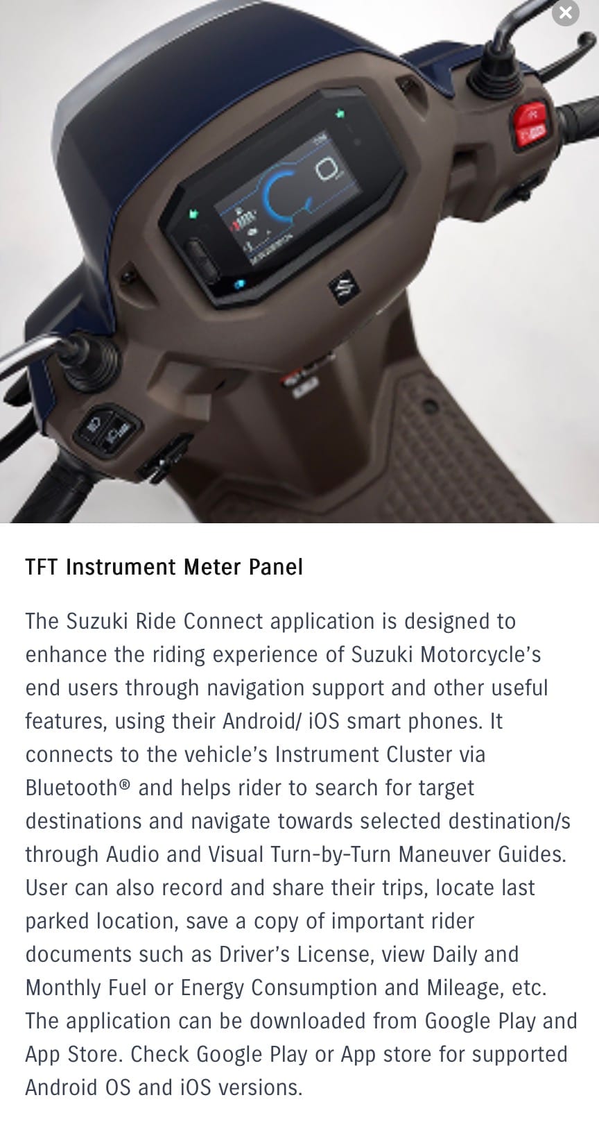 The Access takes cues from scooters of the past — think metal front fender, leg shield, clean silhouette — yet under the skin you’ll find features aimed squarely at the smart-commuter. Highlights include an external fuel filler cap, metal-finish fender and leg shield, LED lighting, and on the Ride Connect Edition model a TFT screen with smartphone pairing. You also get a quieter starter via a one-way clutch gear, supporting a smoother and more refined ride.